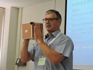 How does social distancing change the spread of COVID? Why do cicadas only appear in prime numbered years? What do cell phone antennas, African villages, and Lord of the Rings movies have in common? How is high school geometry now used to destroy kidney stones? How does a deck of cards hold more possibilities than there are grains of sand on Earth? Is there a best way to cut diamonds? How does UPC coding work? How are prime numbers used to protect online transactions? Why are Pringles potato chips all the same shape? How are the digits of Pi used in forensic accounting? Why should contestants always change doors on Let’s Make A Deal? All of these questions have mathematical explanations. Let’s explore these and other amazing connections between math and nature, music, art, finance, and more. Many hands-on activities.